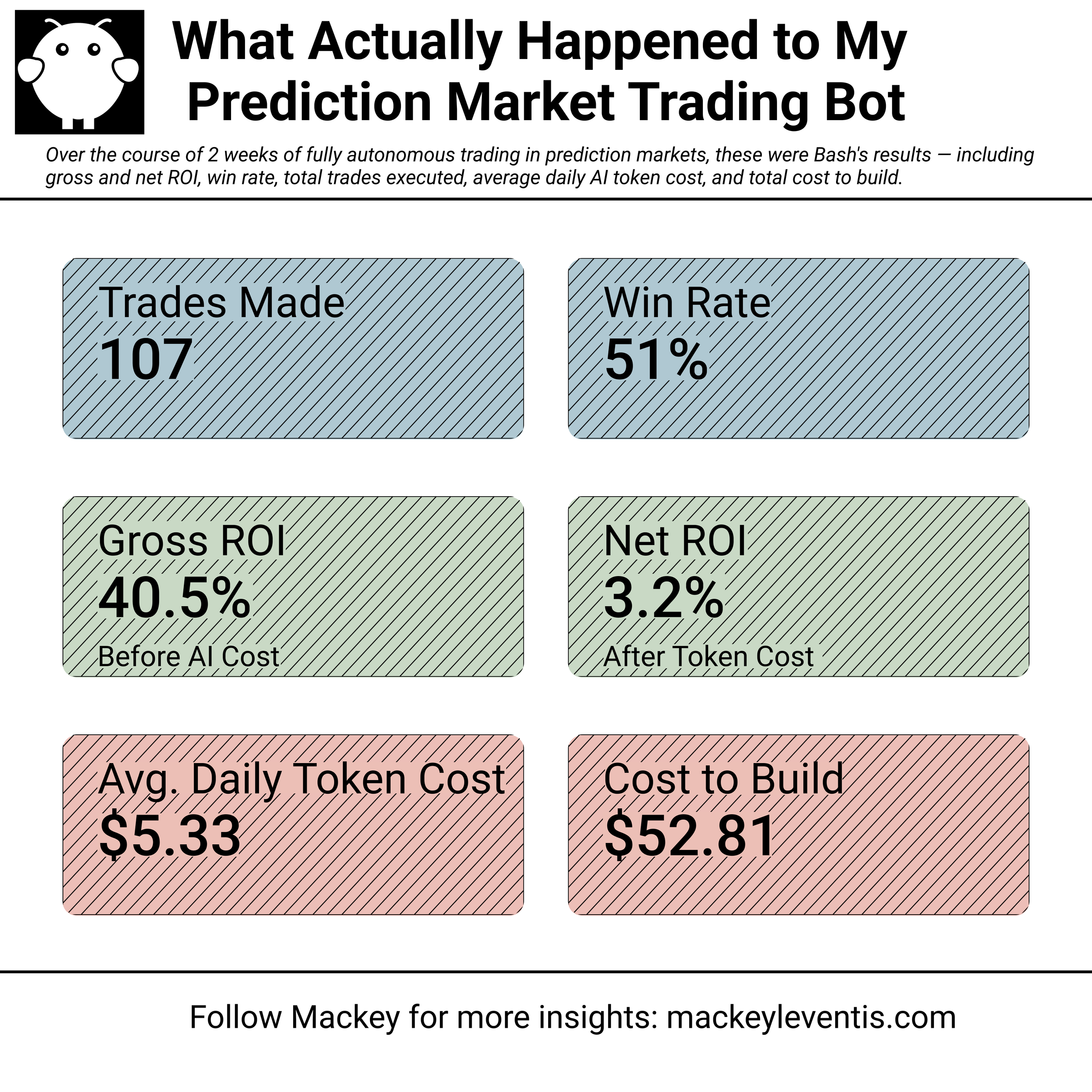 We started with me manually feeding him markets and talking through pricing strategies to find inefficiencies. That went well, so I hooked him up with API trading access, gave him some basic frameworks, and let him run. After three weeks with some weekly parameter tweaks, here's how he did: